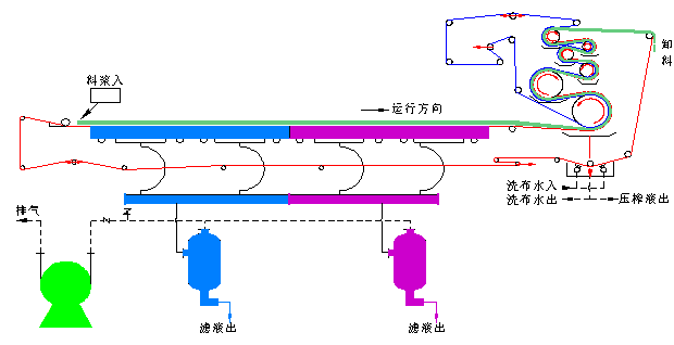 真空帶式壓榨過濾機是以濾帶為過濾介質(zhì),充分利用物料的重力、真空吸力、S形輥擠壓力實現(xiàn)固液分離的高效分離設(shè)備。采用整體可拆式過濾盤作為真空室,以S形擠壓輥作為外力,濾帶在電機拖動下做連續(xù)運行,過濾行程開始時,濾盤在真空狀態(tài)下與濾帶同步運行,在非真空狀態(tài)下濾盤與濾布作相對運行。物料通過料漿分布器均布在真空濾盤的過濾帶上,濾帶上料漿在真空吸力的作用下進行抽濾,直到真空濾盤碰到接近開關(guān)位置,下濾帶的濾餅在電機的拖動下繼續(xù)運行并進入S形擠壓輥同時上濾帶在物料進入S形擠壓輥后進行擠壓以降低濾餅含濕量。過濾、洗滌、再過濾、擠壓后的濾餅經(jīng)刮刀裝置將濾餅剝離卸除,濾布經(jīng)自動再生裝置清洗后,再經(jīng)過一組支承輥和糾偏裝置重新進入過濾區(qū),集液罐濾液隨著濾盤返回同時排出,擠壓輥中的濾液流入收集盤。通過這樣周而復(fù)始的抽濾、洗滌、再抽濾、擠壓,從而實現(xiàn)固液分離的目的。